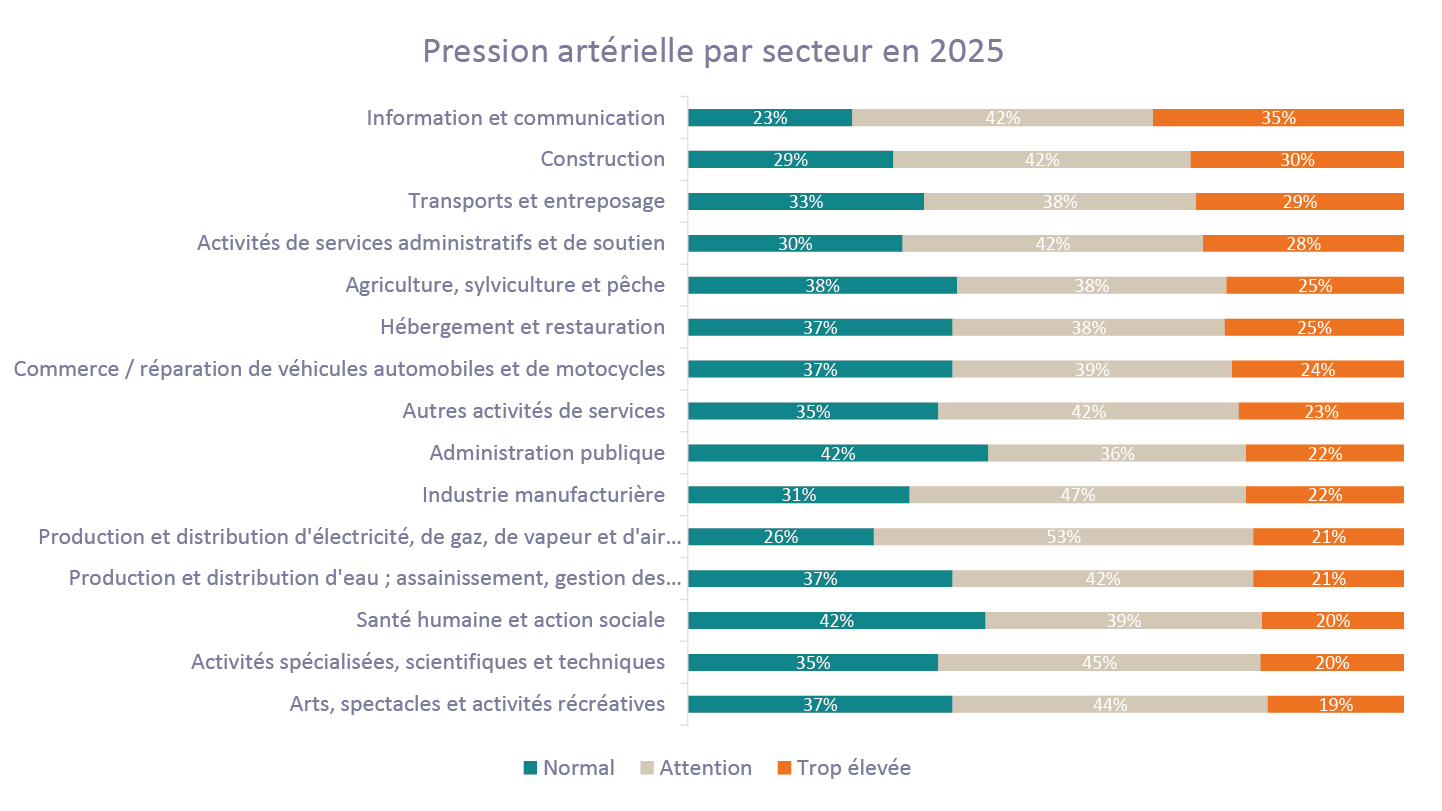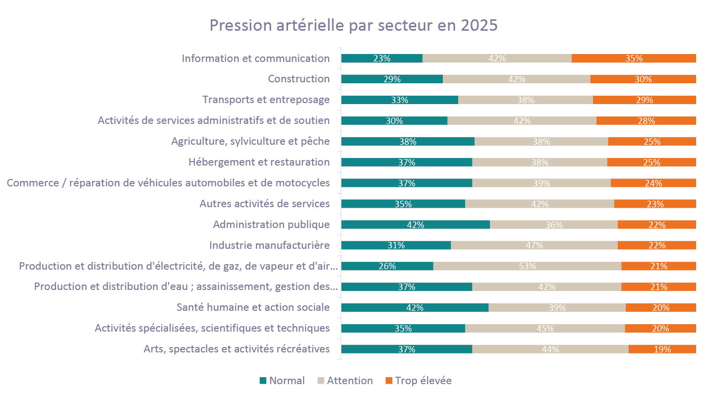 L'analyse d'Attentia révèle par ailleurs d'importantes différences selon les secteurs. L'IT, les télécommunications et la consultance arrivent en tête, avec 35% de travailleurs hypertendus. La construction suit avec 30%, un niveau également supérieur à la moyenne. Dans ces secteurs, les travailleurs hypertendus sont même plus nombreux que ceux présentant des valeurs normales. À l'inverse, les arts, le sport et les loisirs (19%), les activités scientifiques et techniques (20%) et les soins de santé (20%) affichent les taux les plus faibles.
