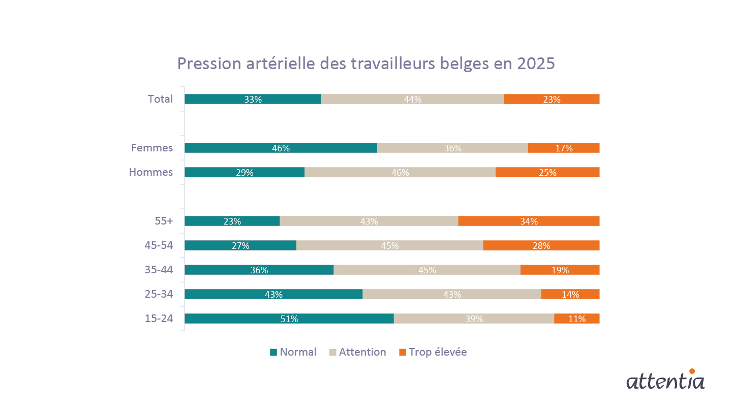 Parmi les travailleurs examinés en 2025 par les médecins du travail d'Attentia, 23% présentaient une hypertension (pression systolique ≥ 140 mmHg et/ou diastolique ≥ 90 mmHg). À cela s'ajoute une large zone à risque: 44% affichaient une tension élevée (systolique entre 130 et 140 mmHg et/ou diastolique entre 80 et 90 mmHg). Seuls 33% des travailleurs examinés présentaient des valeurs de tension normales (systolique < 130 mmHg et diastolique < 80 mmHg).