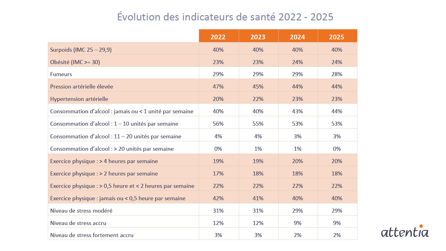 Ces dernières années, la proportion de travailleurs en surpoids ou hypertendus a peu évolué. Pour inverser la tendance, Attentia plaide pour une approche ciblée du mode de vie sédentaire.