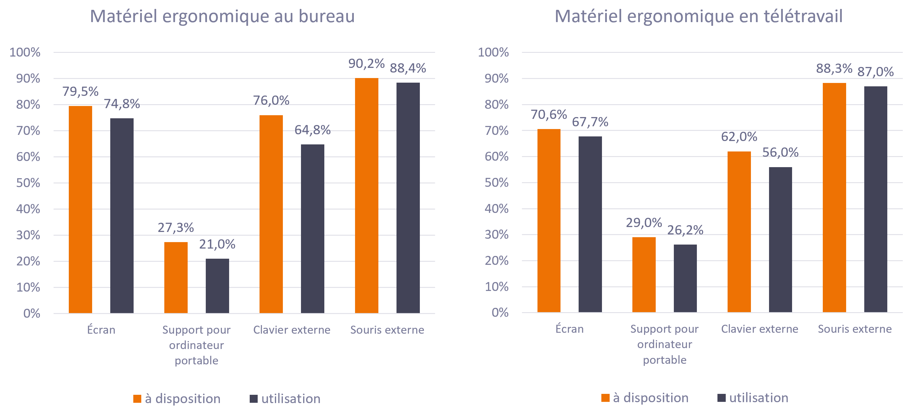Chez eux, 62% des employés disposent d'un clavier externe, mais ils ne sont que 56% à l'utiliser effectivement. Au bureau, ces pourcentages atteignent respectivement 76% et 64,8%. Les grands écrans sont un peu plus fréquents et la souris demeure l'accessoire le plus souvent utilisé.