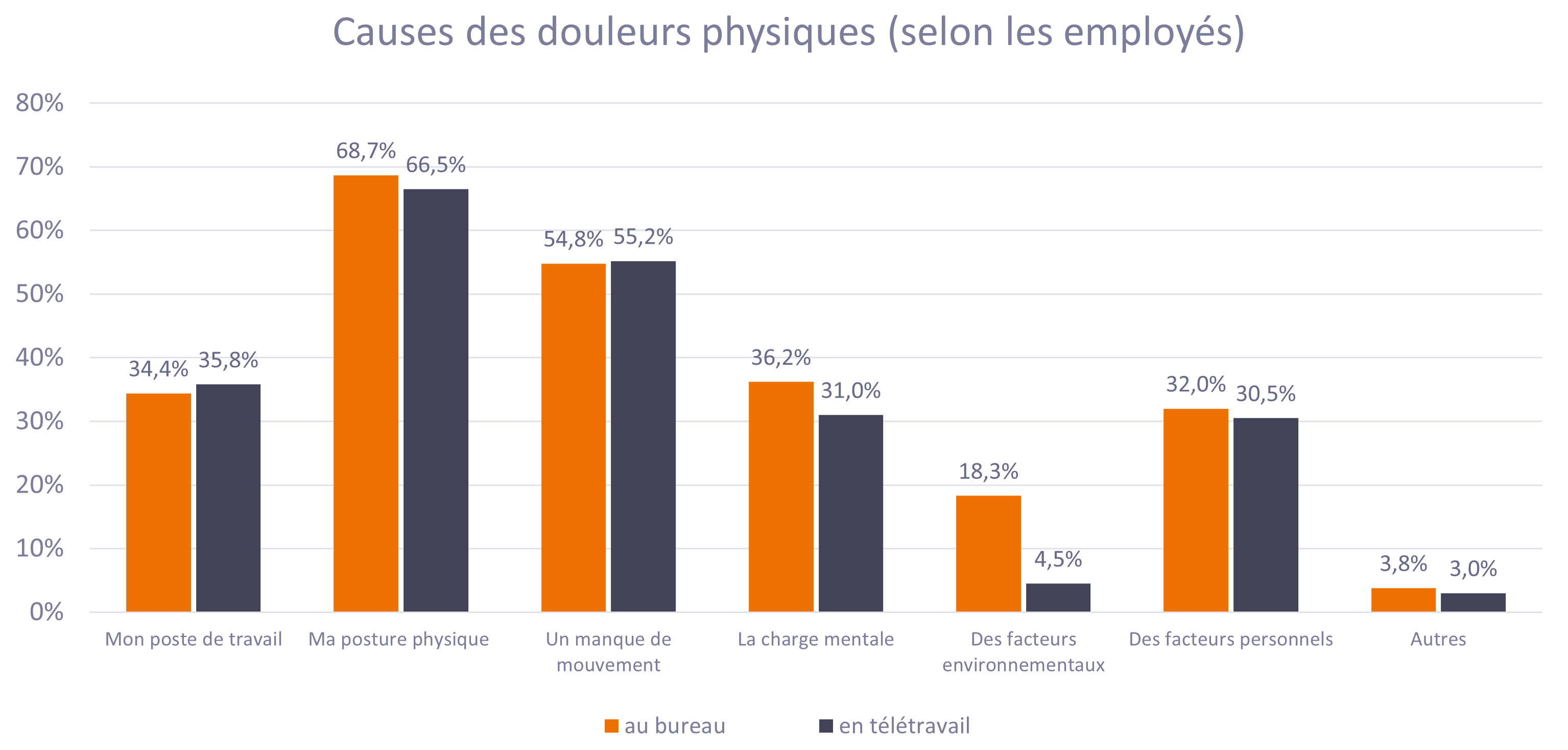 Les employés de bureau admettent eux-mêmes que leurs troubles physiques viennent surtout d'une mauvaise posture et d'un manque de mouvement. Ils évoquent également la charge mentale, comme la pression au travail ou un manque de liberté dans leur organisation comme élément déclencheur. « Ce n'est pas surprenant », indique Dorien van Limbergen. « Les tensions musculaires et le stress peuvent considérablement aggraver les douleurs ».