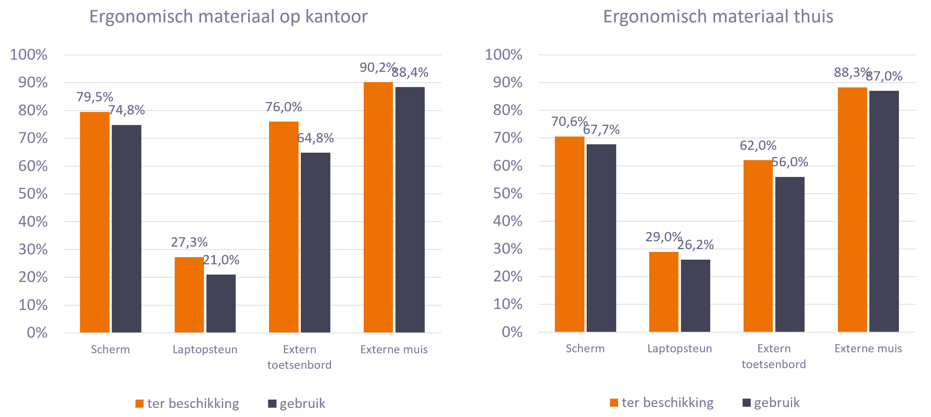 Thuis beschikt 62% van de werknemers over een extern toetsenbord, maar slechts 56% gebruikt het effectief. Op kantoor bedraagt de beschikbaarheid 76% en het gebruik 64,8%. Externe schermen zijn iets meer ingeburgerd; een externe muis is het meest gebruikte hulpmiddel.