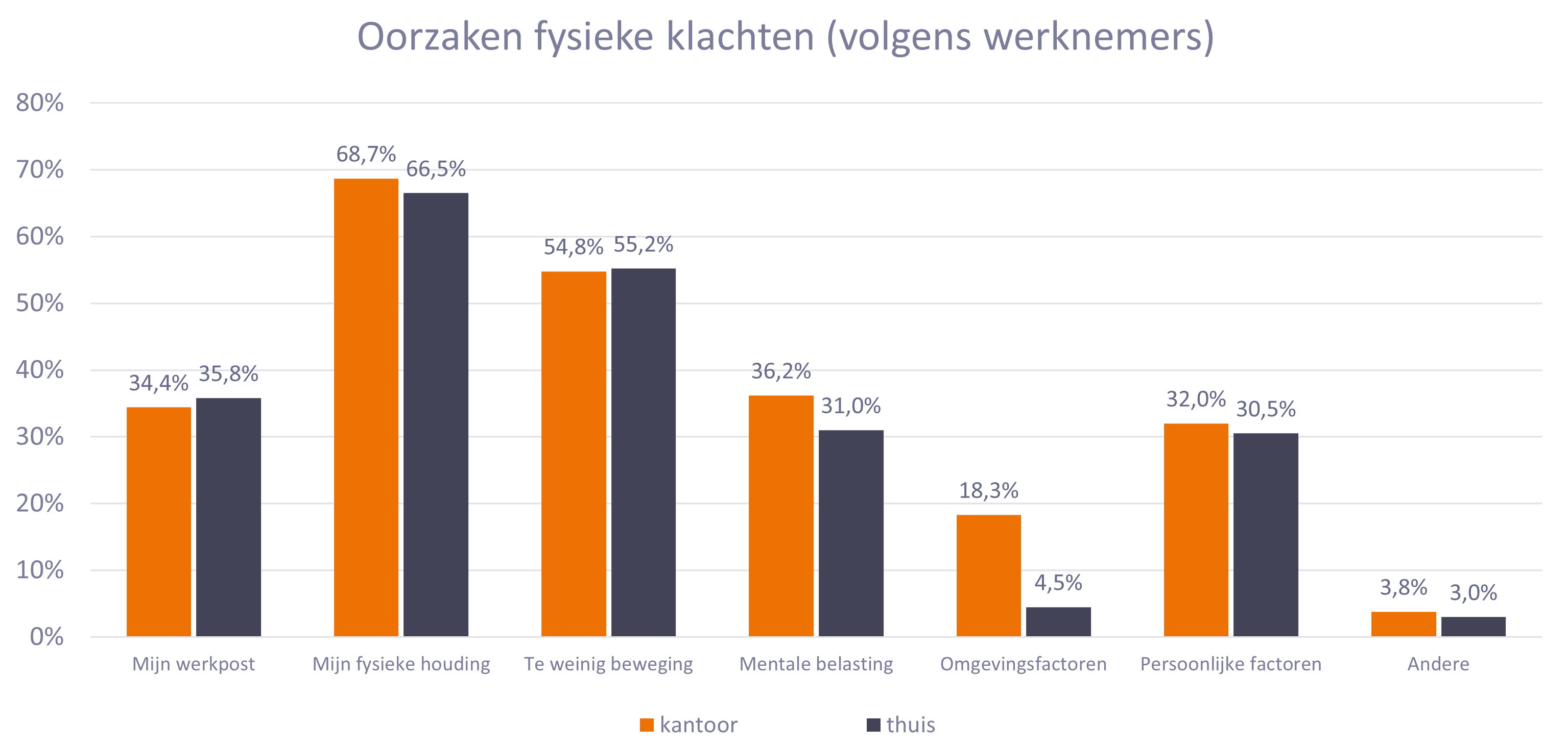 De oorzaken verschillen weinig tussen werken op kantoor of thuis, behalve wat omgevingsfactoren betreft: werknemers geven duidelijk aan dat ze op kantoor meer hinder ondervinden van bijvoorbeeld te veel lawaai of storend licht.