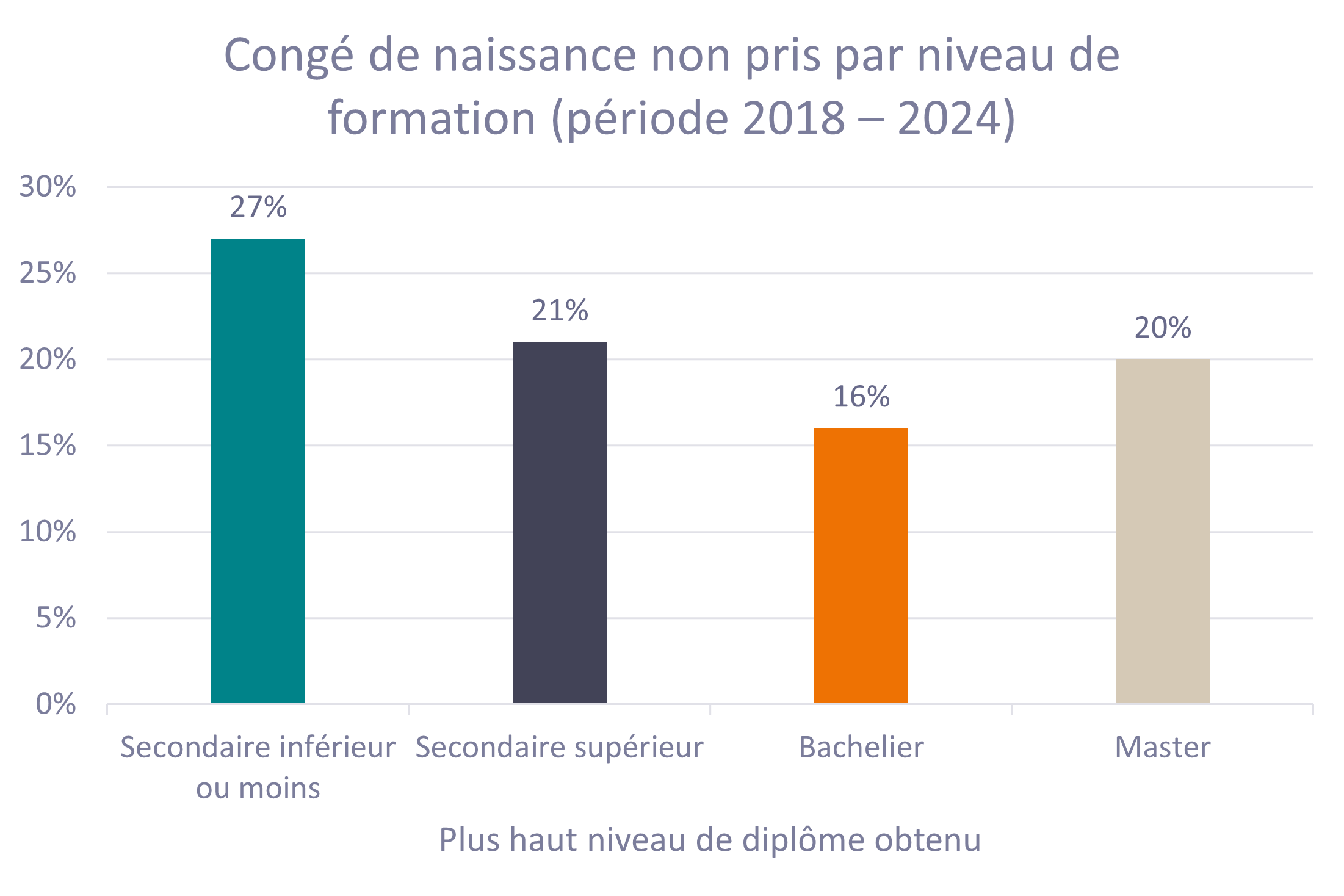 - Et les pères ou les coparentes qui ne disposent que d’un diplôme de l’enseignement secondaire inférieur prennent moins souvent l’intégralité de leur congé de naissance que ceux qui ont obtenu un diplôme de niveau supérieur.