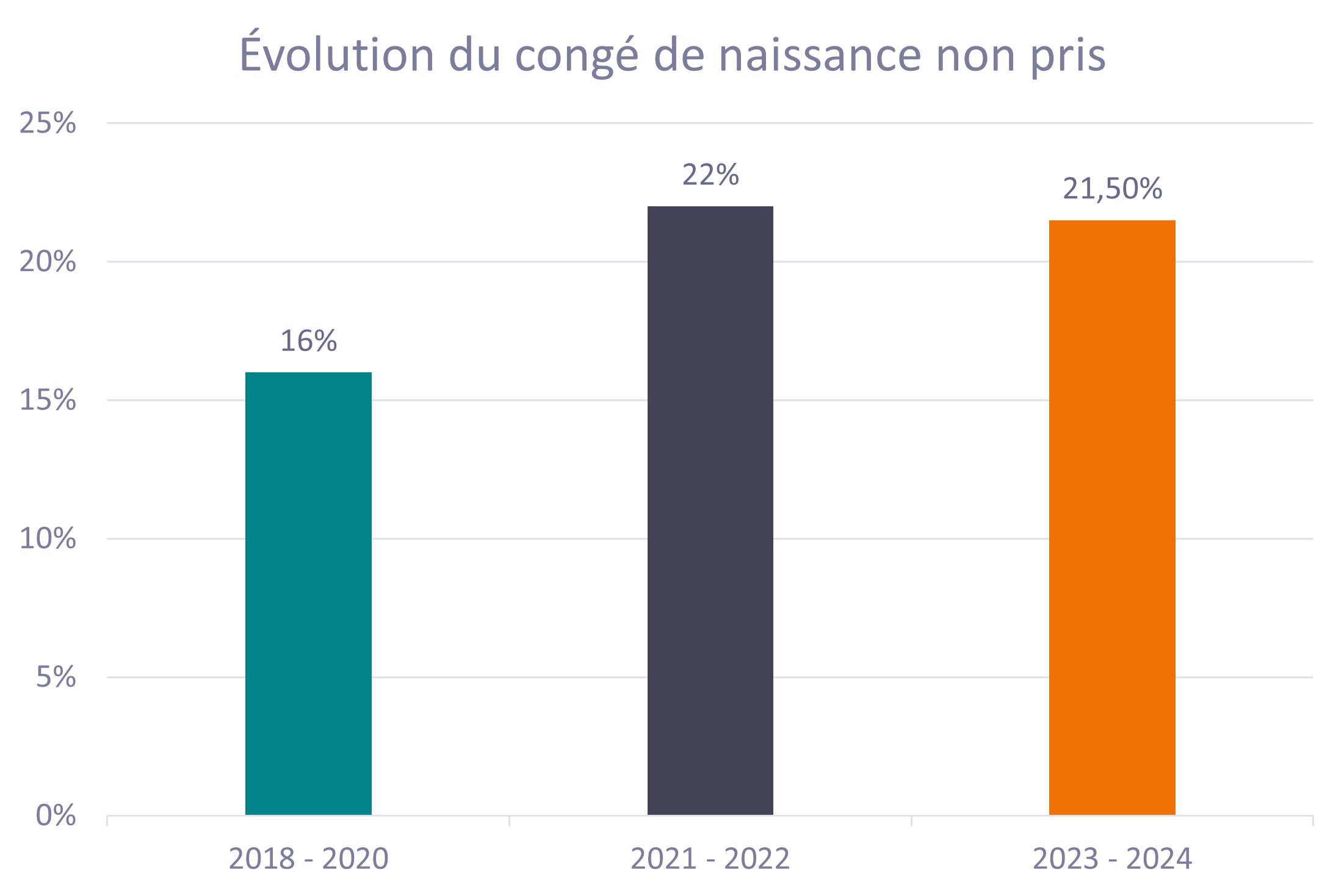 À partir de 2021, lors de l’allongement du congé de naissance à quinze jours, le pourcentage de pères et de coparentes qui y ont renoncé est passé à 22%. Même après l’allongement du congé de naissance à vingt jours, en 2023, plus d’un cinquième des pères et des coparentes (21,5%) n’ont pas pu ou n’ont pas voulu le prendre dans son intégralité.