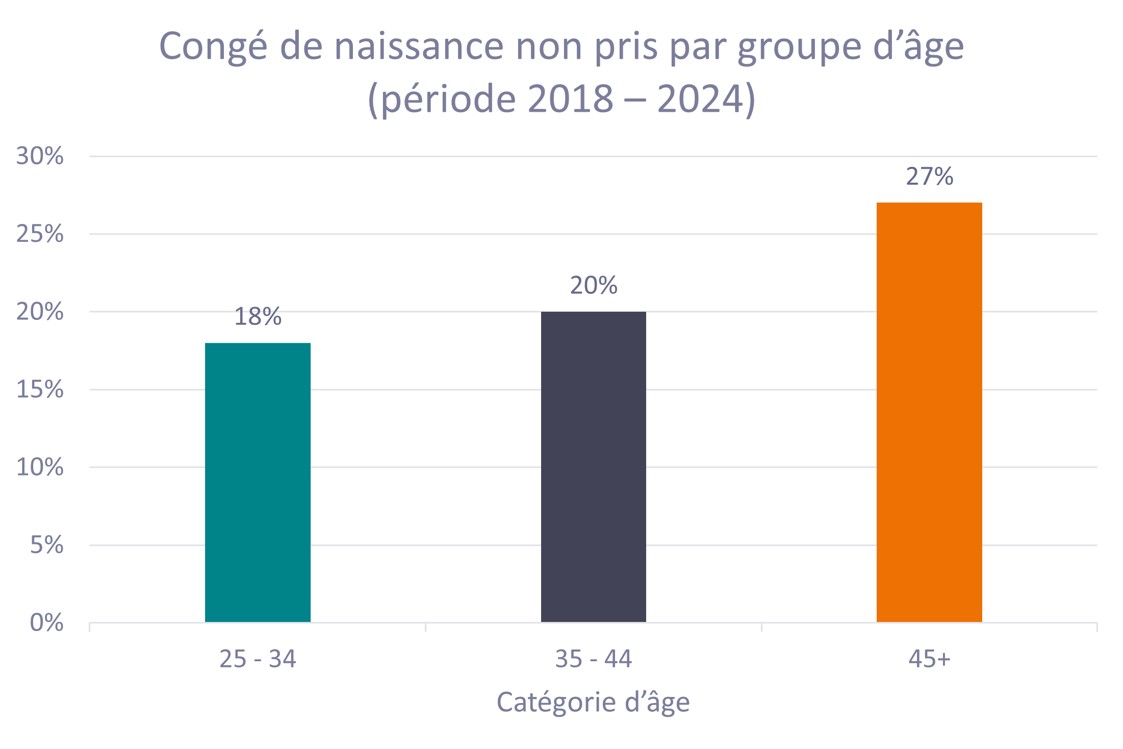 L’âge joue également un rôle. Près d’un tiers (27%) des pères et coparentes de plus de 45 ans ne prennent pas l’intégralité des jours de congé de naissance auxquels ils ont droit. Chez les 25 - 34 ans, ce chiffre s’élève à peine à 18%.
