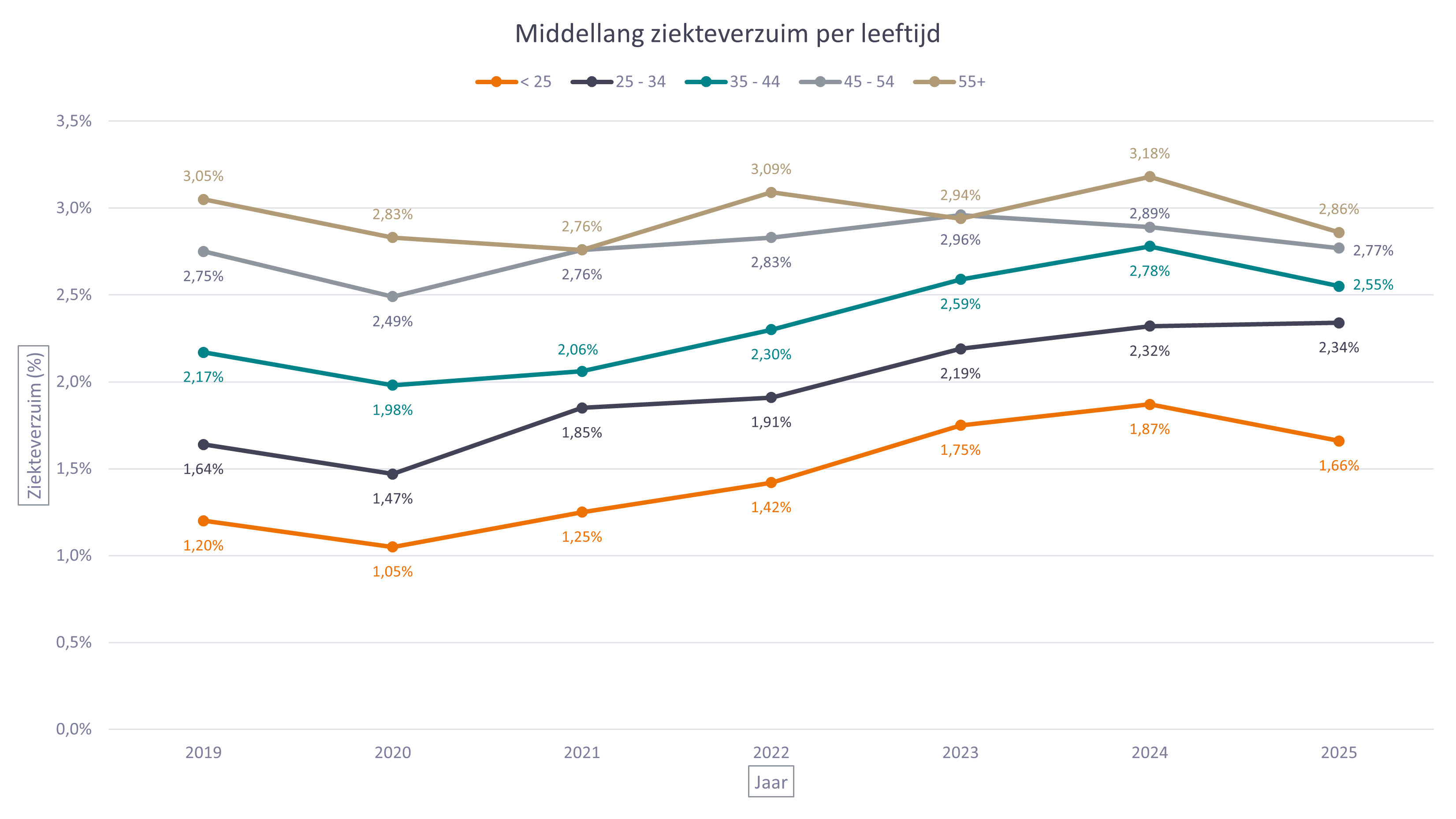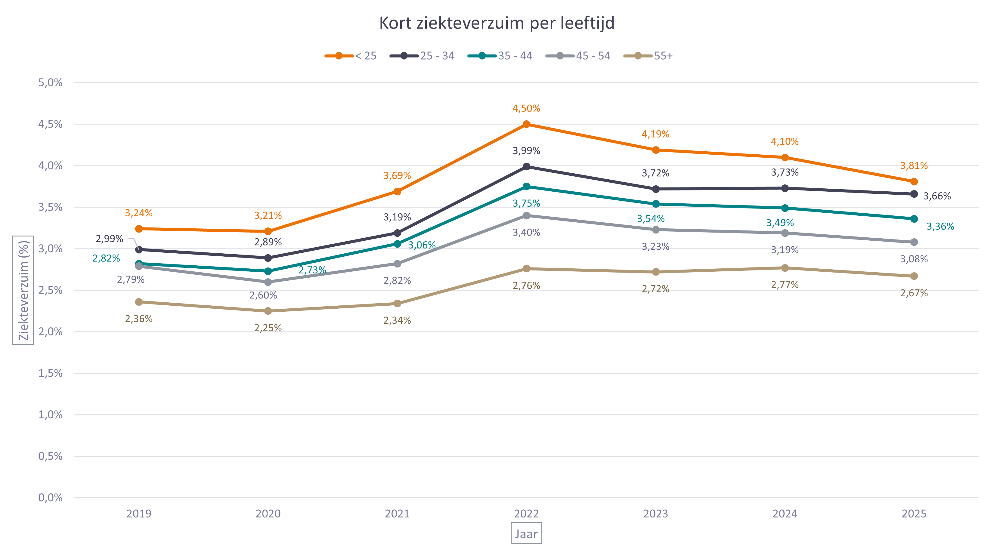 Terwijl het langdurig ziekteverzuim toenam naarmate werknemers ouder worden, daalde het kort verzuim net met de leeftijd. Bij de 55-plussers was dit 2,67%, tegenover 3,66% bij de 25 tot 34-jarigen en 3,91% bij werknemers jonger dan 25.