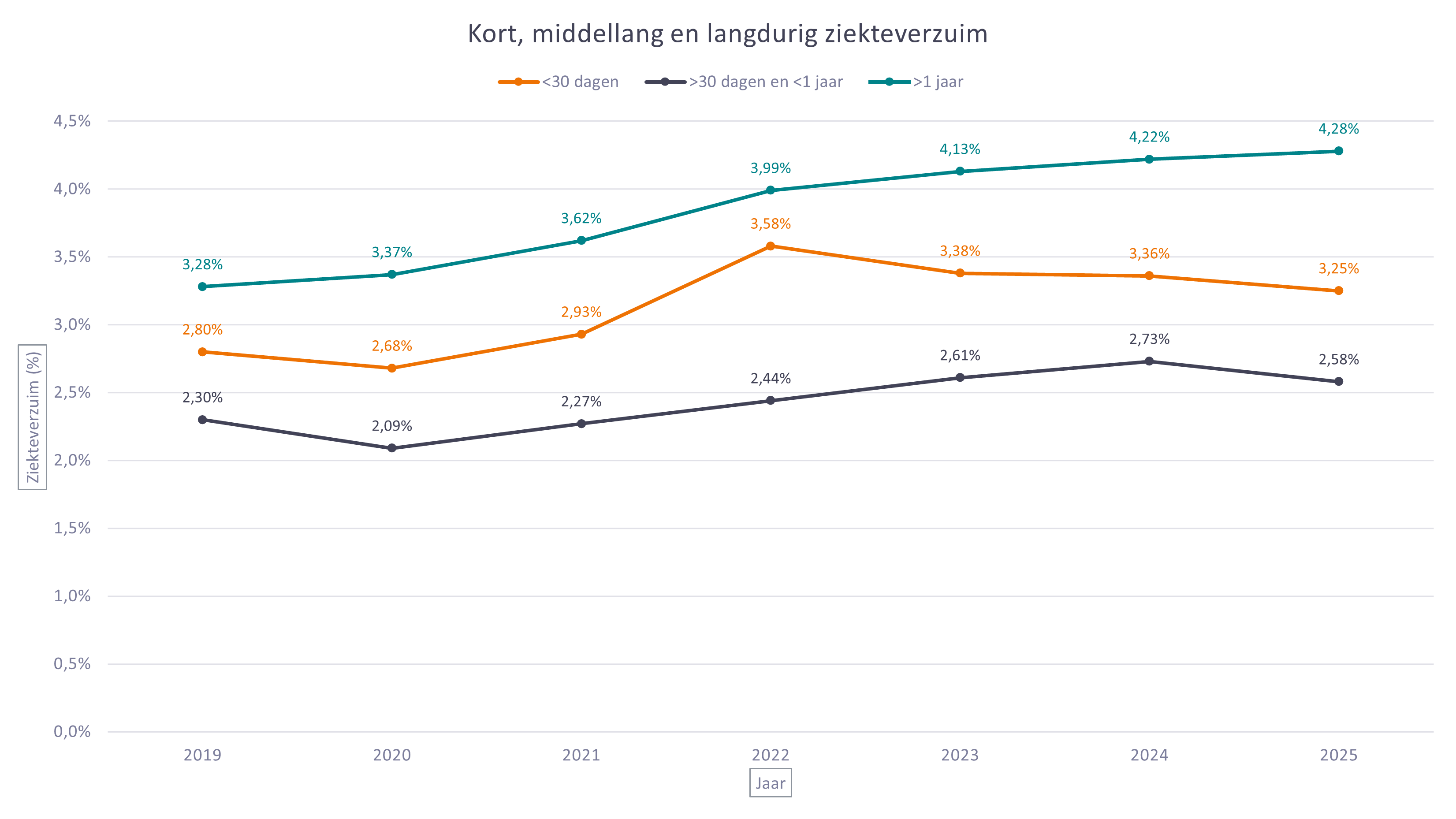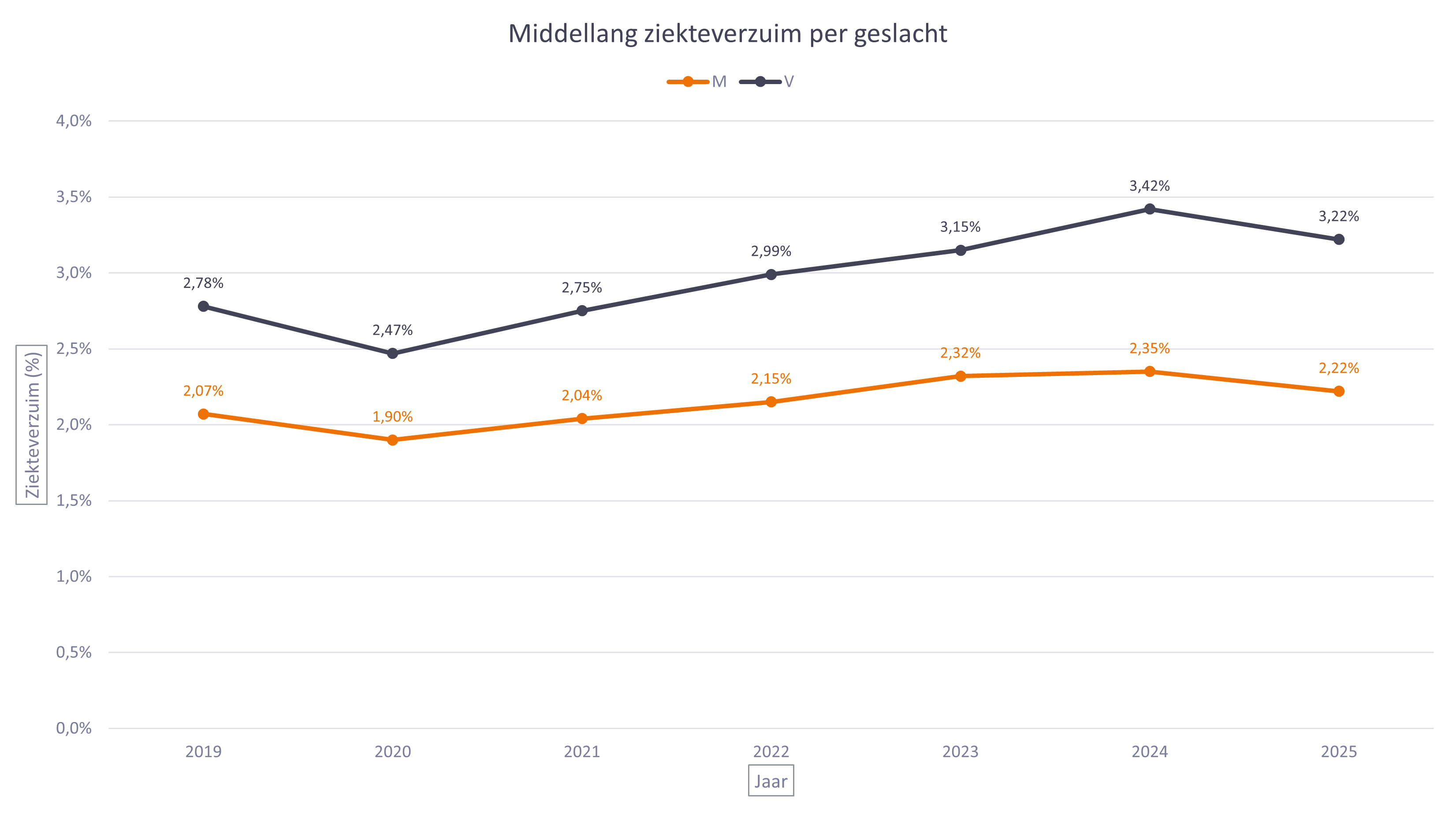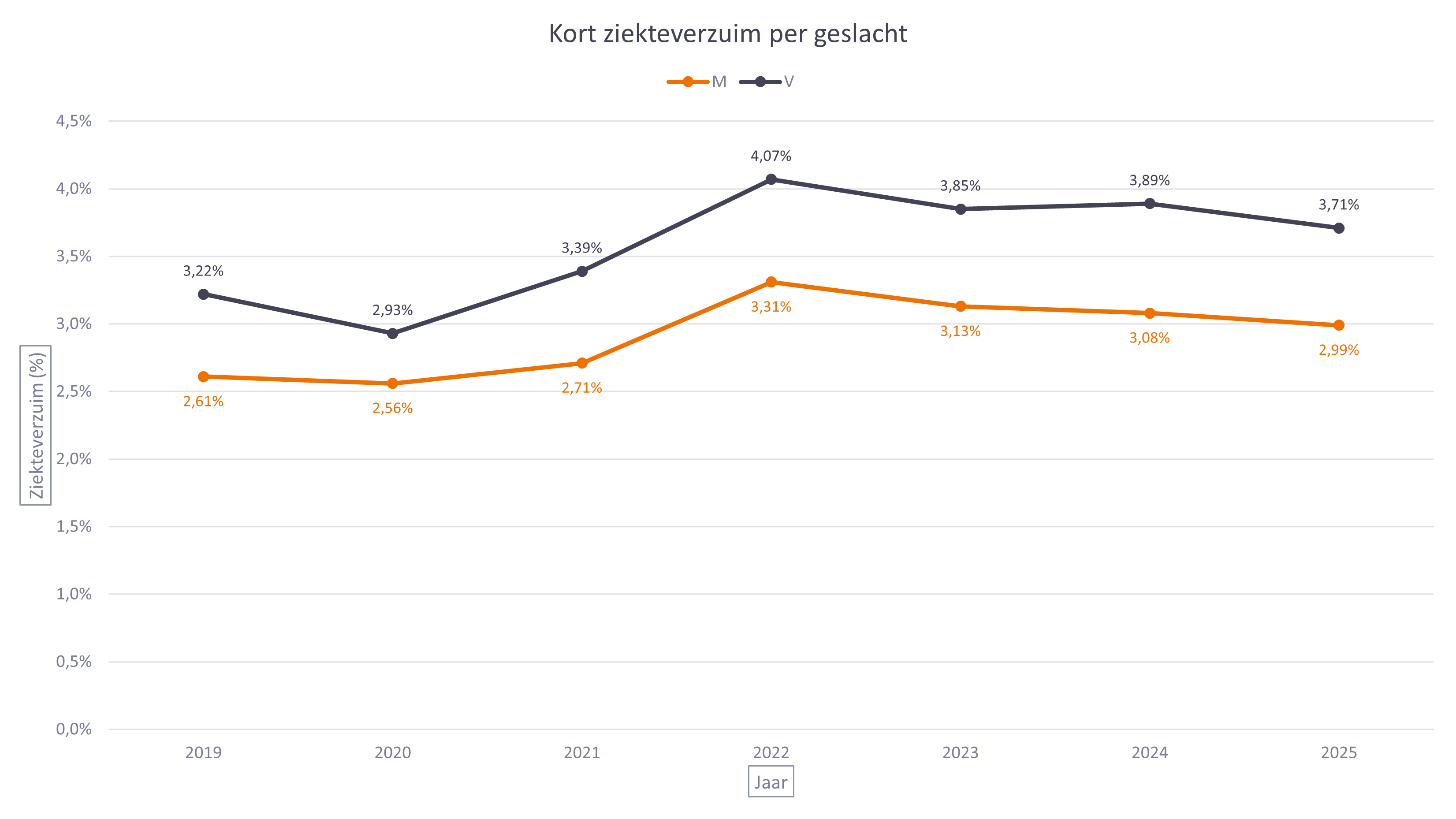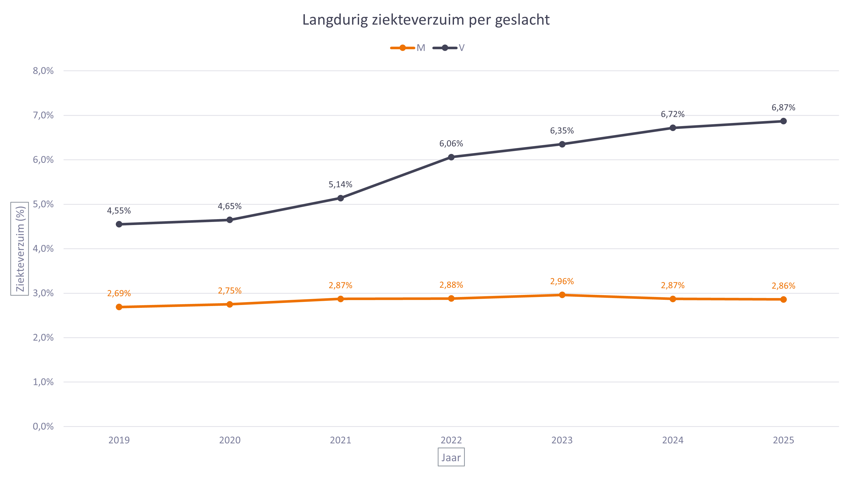 Vooral de genderkloof springt in het oog. Vrouwen waren in 2025 ruim dubbel zo vaak langdurig ziek als mannen: 6,87% tegenover 2,86%. Bij het middellang (3,22% tegenover 2,22%) en kort verzuim (3,71% tegenover 2,99%) was de kloof minder groot. De daling van het kortere verzuim gold bovendien zowel voor mannen als voor vrouwen.