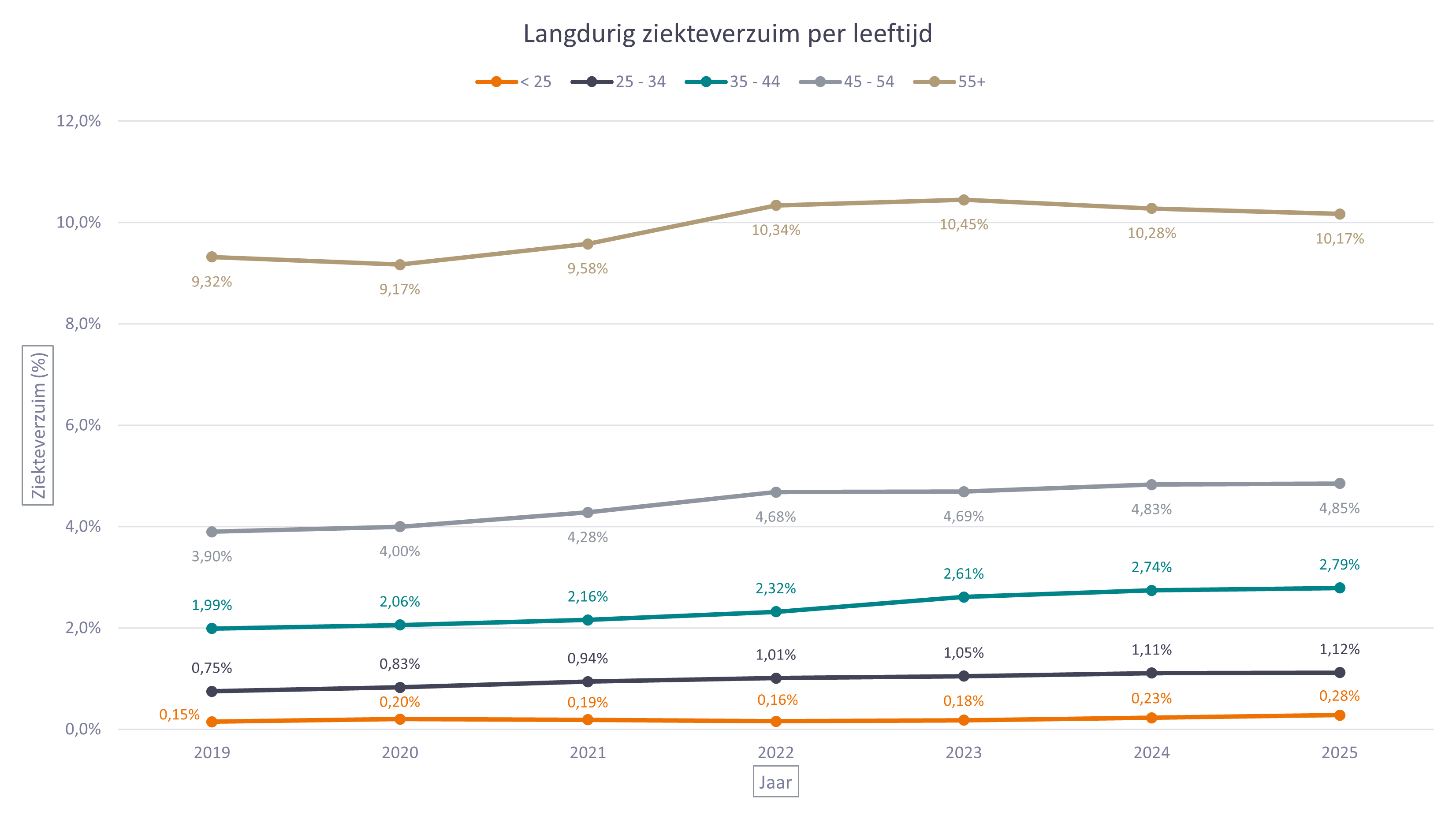 Ook de leeftijd speelt een cruciale rol: werknemers ouder dan 55 jaar waren met 10,17% veel vaker langdurig ziek dan hun jongere collega’s (4,85% bij de 45 tot 54-jarigen, 2,79% bij de 35 tot 44-jarigen enz.). Al was er wel sprake van een lichte daling ten opzichte van 2024 (10,28%).